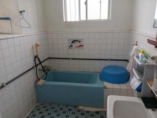 昔ながらの水回りの作りで、浴室内に洗面器と洗濯機が設置されていました。