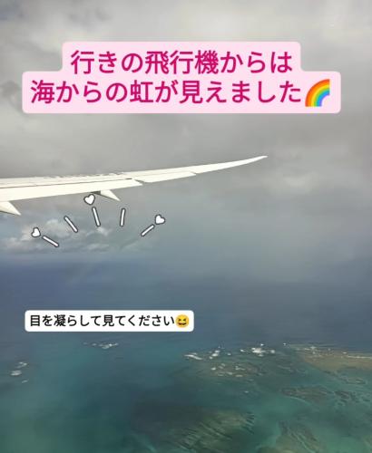 行きの飛行機から海を見下ろすと、海から虹が出てる~!